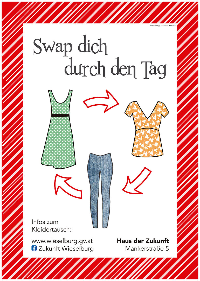 Es folgte eine Reihe von Swap-Partys, die jeweils im Frühjahr und im Herbst im Haus der Zukunft stattfanden. Je nach Saison konnten konnte Sommer- und Winterkleidung sowie Übergangskleidung getauscht werden. Das Prinzip war folgendes: gegen einen Unkostenbeitrag von 50 Cent durften die Teilnehmer-/innen bis zu fünf gut erhaltene Kleidungsstücke mitbringen. Beim Check-In wurde die Anzahl der mitgebrachten Teile registriert und ein Tausch-Pass ausgegeben, mit dem man die gleiche Anzahl an Kleidungsstücken auswählen und mitnehmen konnte. Nicht getauschte Kleidung wurde am Ende des Tages gespendet. Die Veranstaltung wurde von Musik und kleinen Snacks umrahmt.