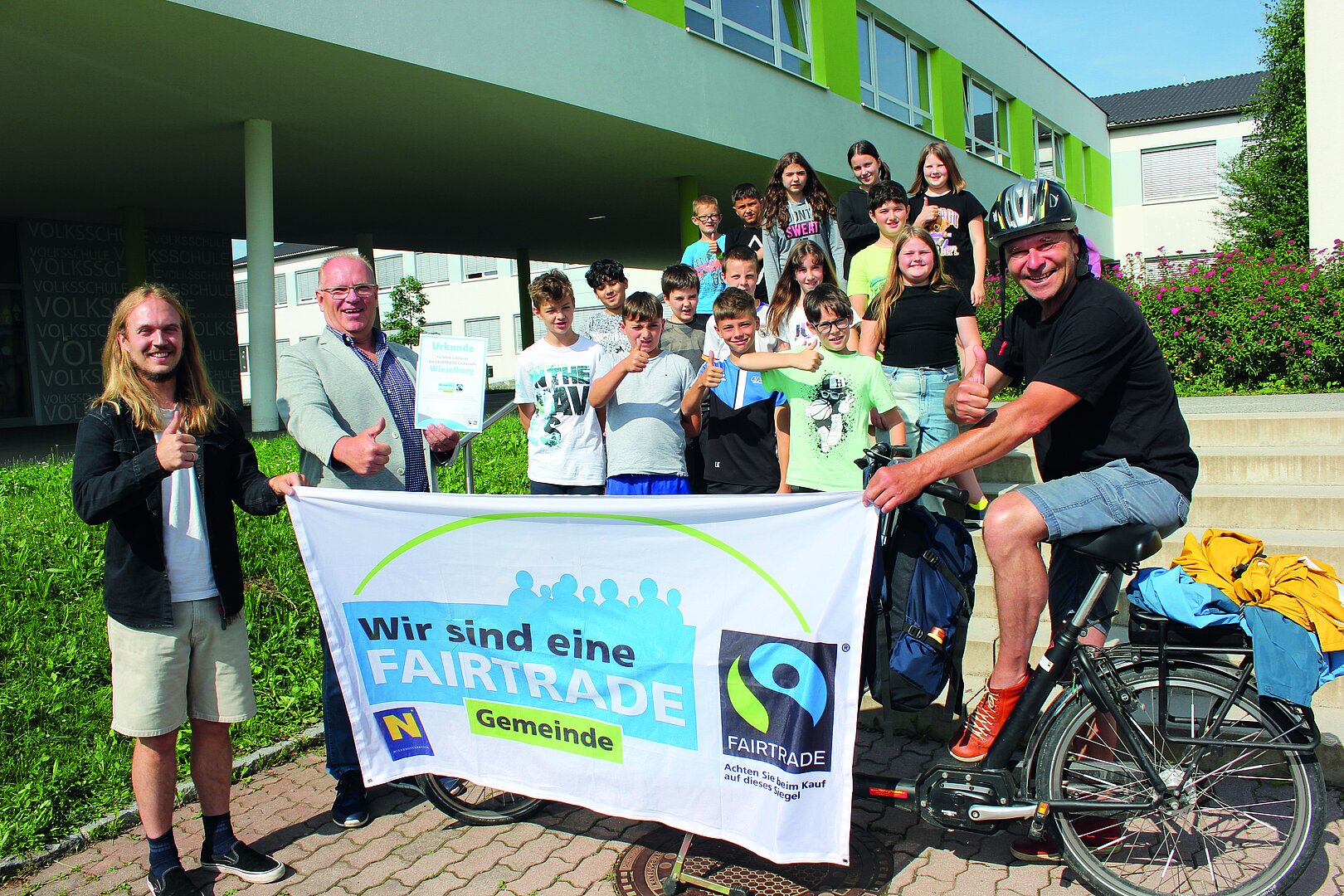 Im Zuge seiner "Fair Bike Tour" durch Niederösterreich besuchte Thomas Wackerling von Fair Trade Österreich mit seinem E-Lastenbike auch Wieselburg und überreichte Stadtrat Josef Lechner eine Urkunde als Anerkennung für das zehnjährige Jubiläum. Dabei machte er Halt bei der Volksschule Wieselburg und informierte interessierte Schülerinnen und Schüler über die Grundidee, die Arbeit und Aktivitäten von FAIRTRADE. Darüber hinaus erklärte er den Kindern, was jede/-r Einzelne tun kann, um die Bemühungen für einen fairen Handel zu unterstützen.