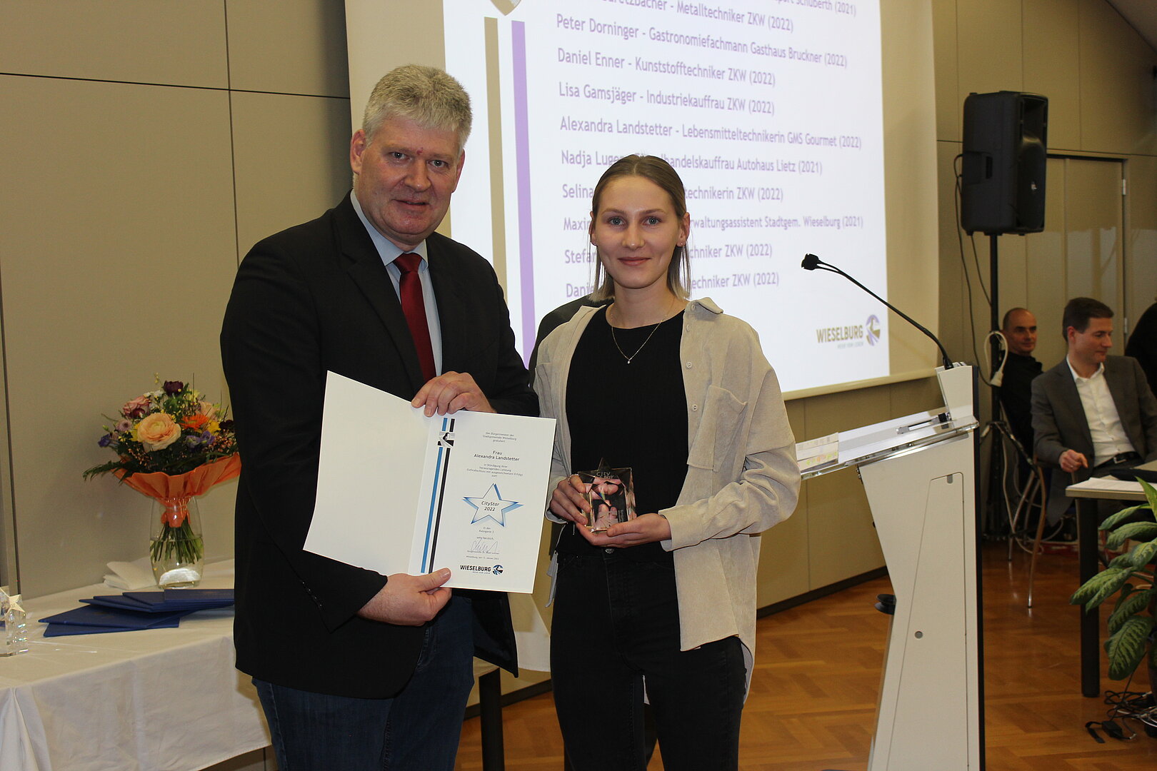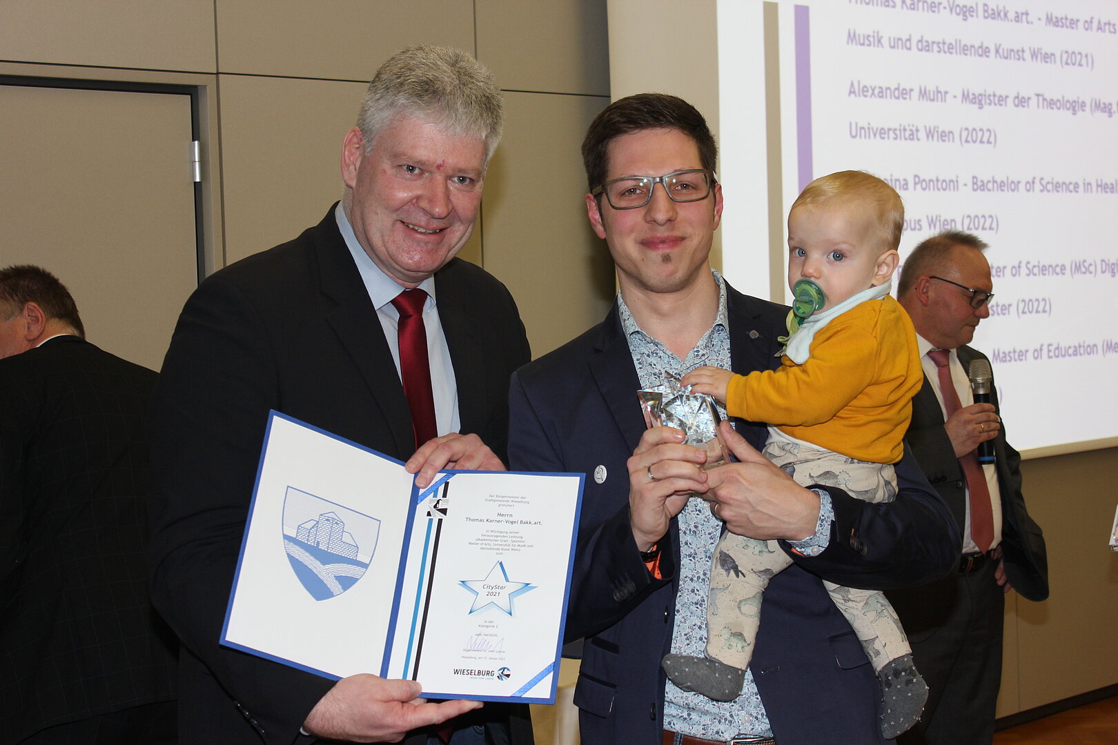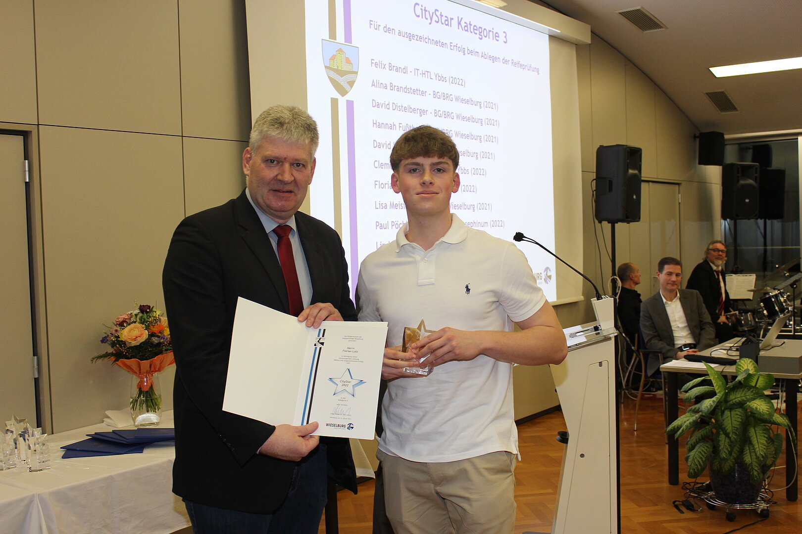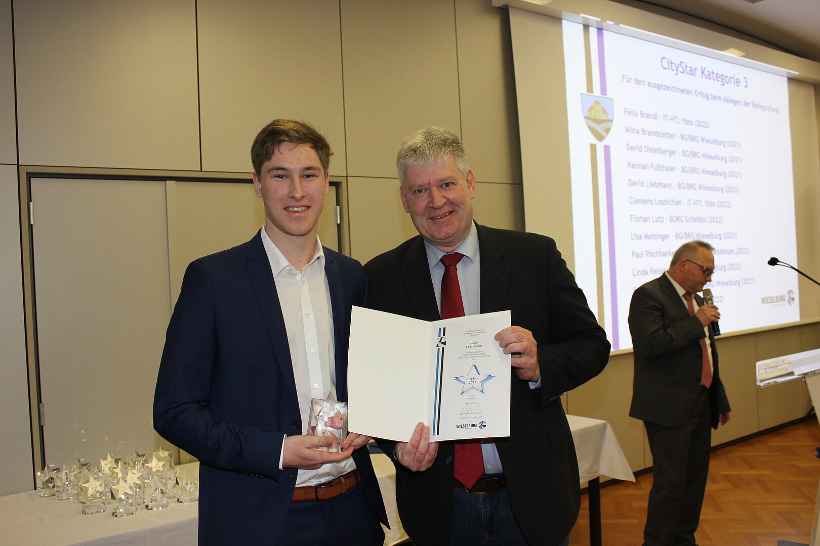 Im Anschluss an die Neujahrsansprache hatte Bürgermeister Josef Leitner die Ehre, die erfolgreichen Maturant/-innen, Lehrlinge und Sportler/-innen mit den City Stars der Kategorien 2 und 3 auszuzeichnen.