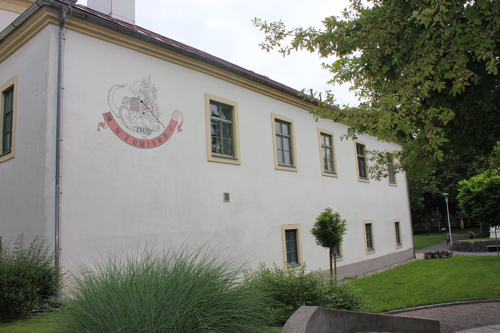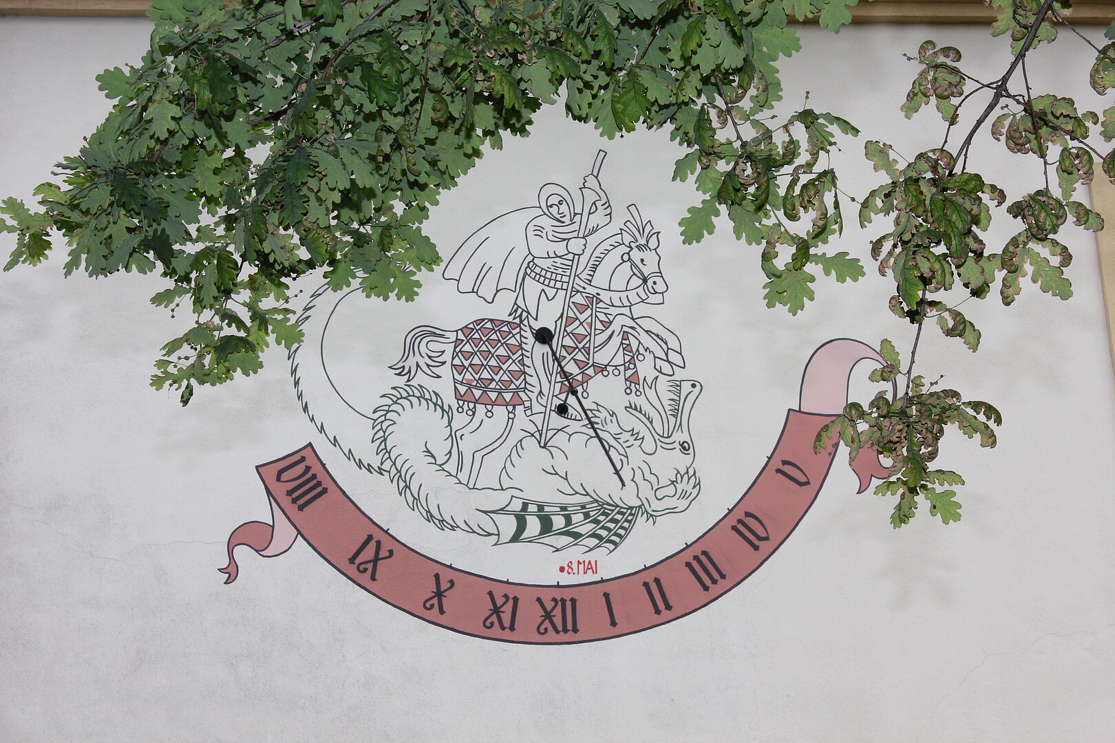 Die im Jahre 1951 am Seitentrakt des Schlosses in Sgrafitto-Technik angebrachte und vom Eingangsbereich des Schlossparkes aus wahrnehmbare Sonnenuhr wurde 1990 entfernt. 2020 kam es dann zu einer Nachbildung („Blau-Pause“) unter Mitnahme von Thema und Motiv an alter Stelle. Über dem Stundenband dieser Wandmalerei sieht man den hl. Georg auf einem Pferd, wie er erfolgreich einen Drachen bekämpft. Das Datum 8. Mai (rot) unter dem Drachenflügel soll an die Erhebung Wieselburgs zur Stadt erinnern.